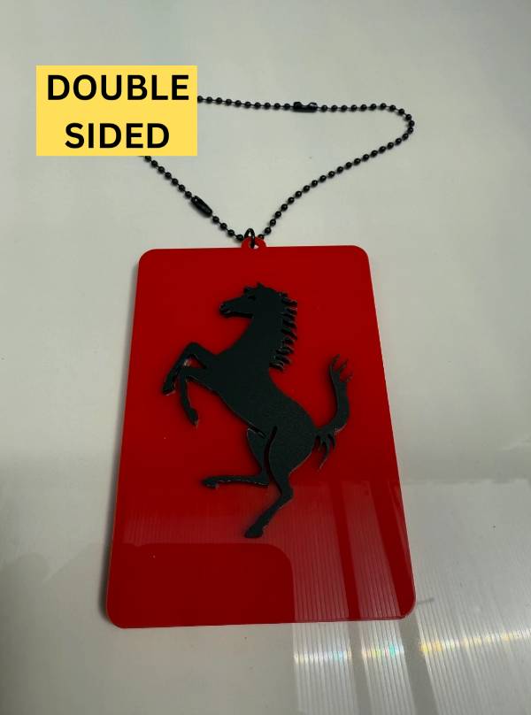 Ferrari red acrylic rear-view mirror hanging pendant. Lightweight, durable, and adds a bold, sporty touch...