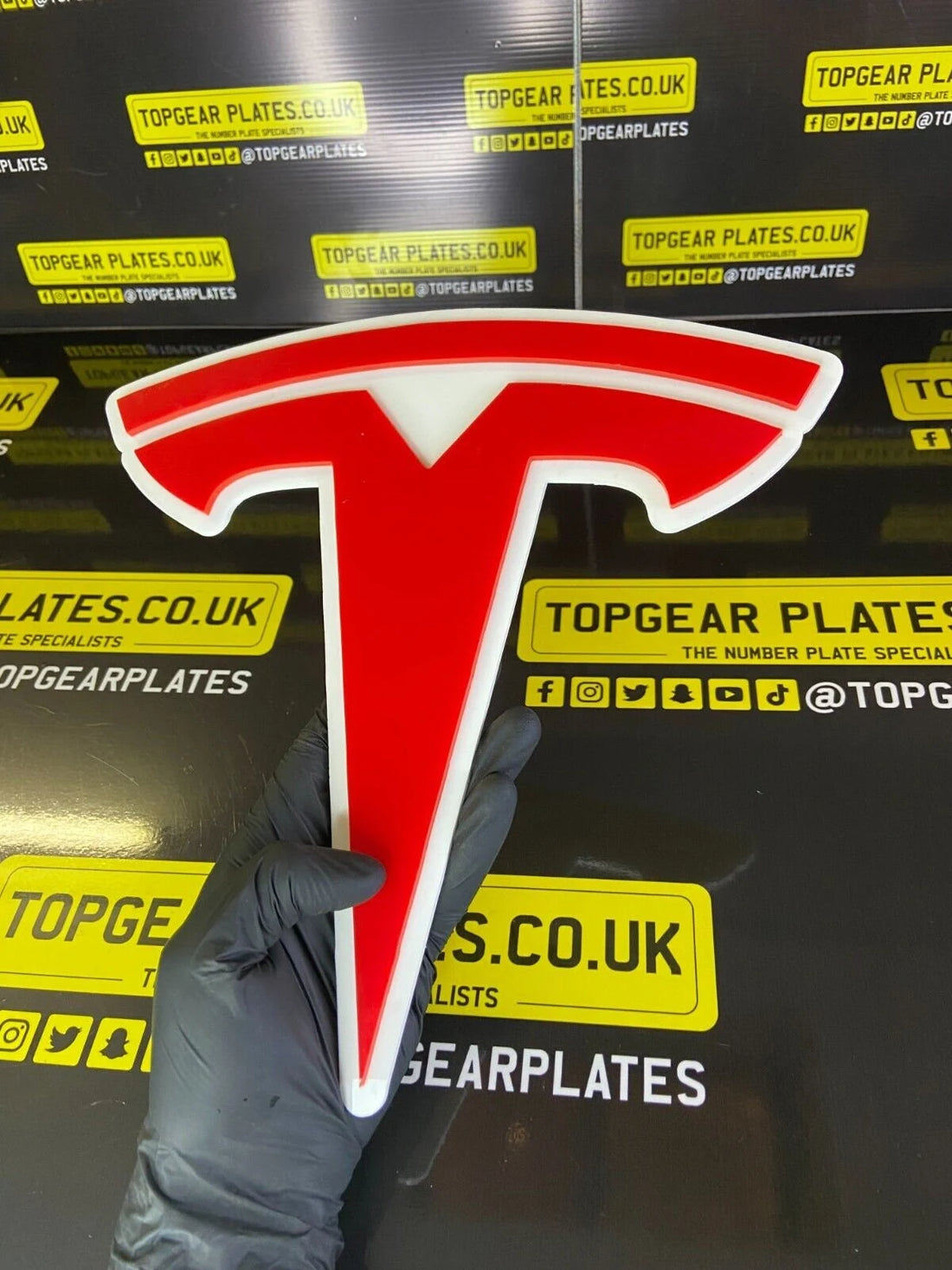 3D Acrylic Stylish Tesla Car/Man Cave/Novelty Sign - White Base/Red Font