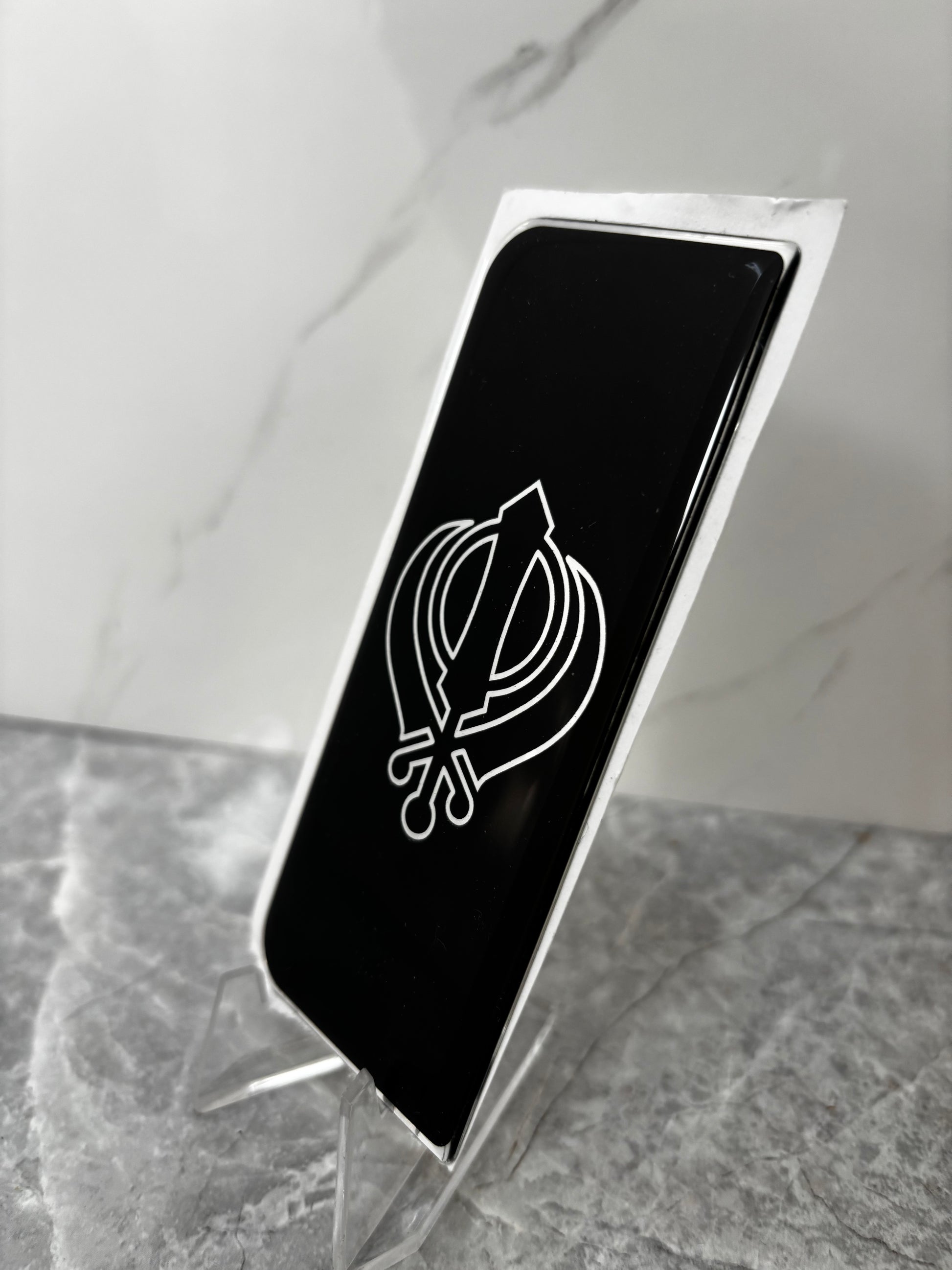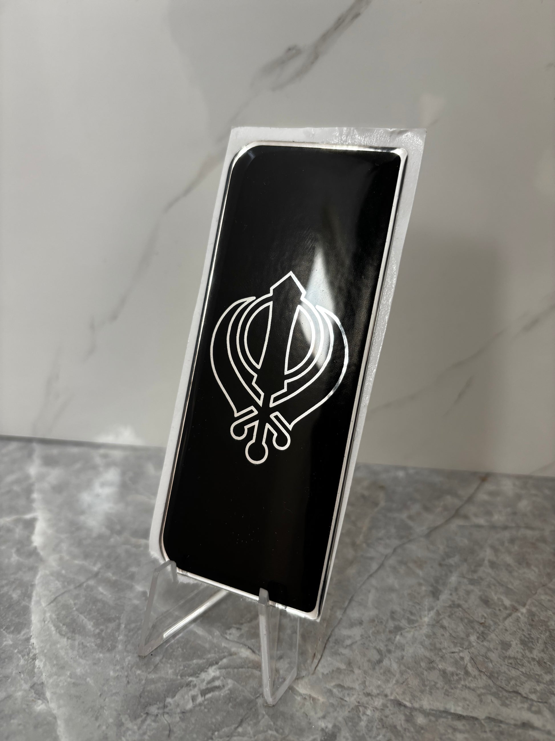 Sleek black display piece featuring a crisp white Khanda symbol. Minimalist and elegant