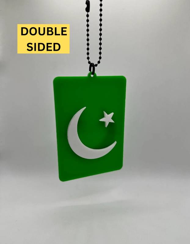 Green and white acrylic car mirror hanging charm inspired by Pakistan. A stylish accessory to show pride while driving.