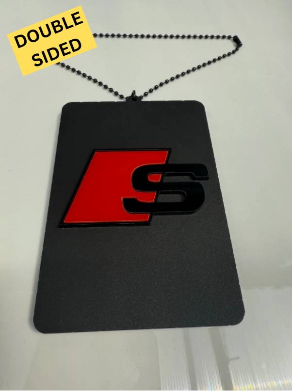 Red Audi S–style acrylic pendant for car rear-view mirror. Lightweight, durable, and adds a sporty touch to your interior.